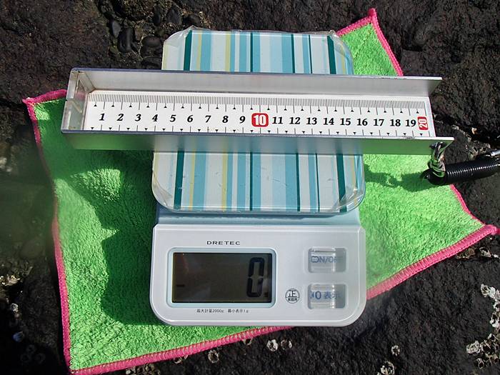 まずは、いつもハゼの長さを測っている自作のスケールを乗せてゼロ設定。