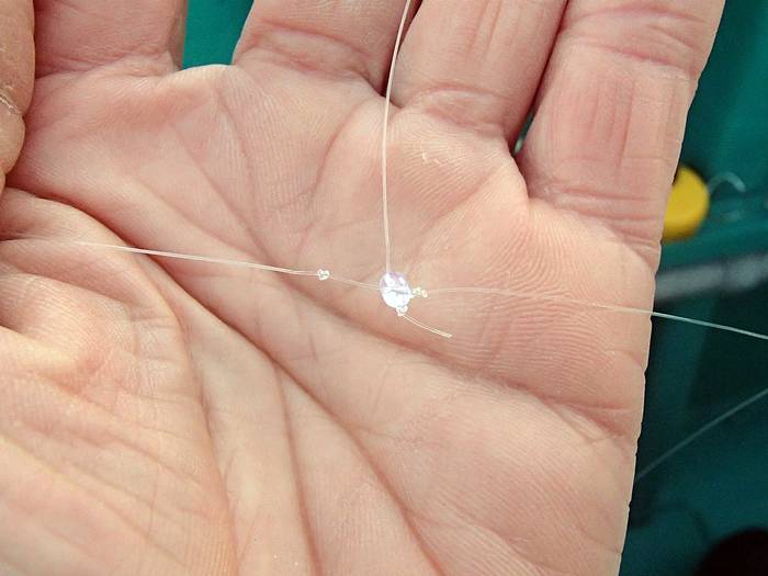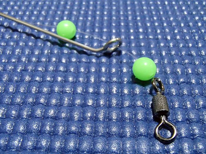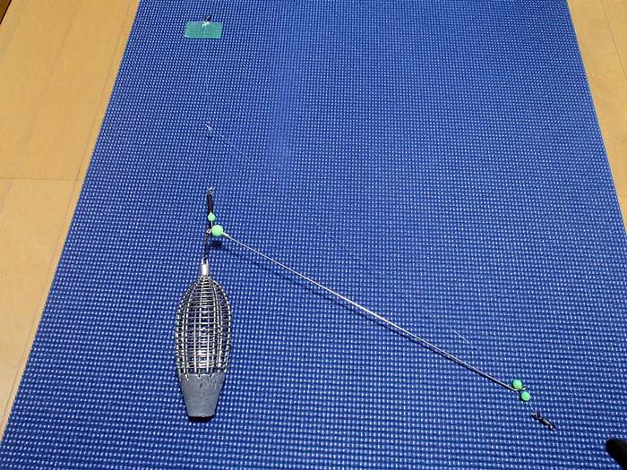 天秤の上に8号のフロロラインをかまして、ソコに5号のフロロラインを接続し、天秤の先端まで通しています。