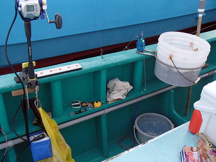 いつものように大型船かと思ったら、ちんまりした小型船にビシアジ釣り用コマセバケツの御用意がされているではありませんか!?