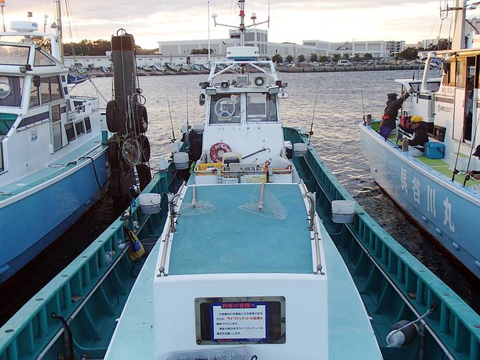 オッサン御一行は右舷で、トモ(一番後ろの釣座)がY氏、胴の間(真ん中)がMT氏、ミヨシ(一番前)がオッサン。