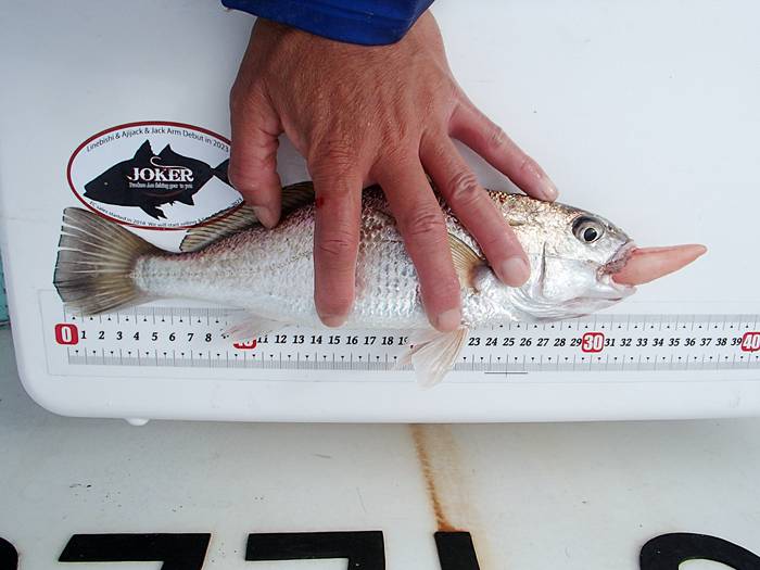 「コレはギガ来たんじゃね?」と期待を込めて慎重に上げてみると、ナイスサイズのイシモチだった。