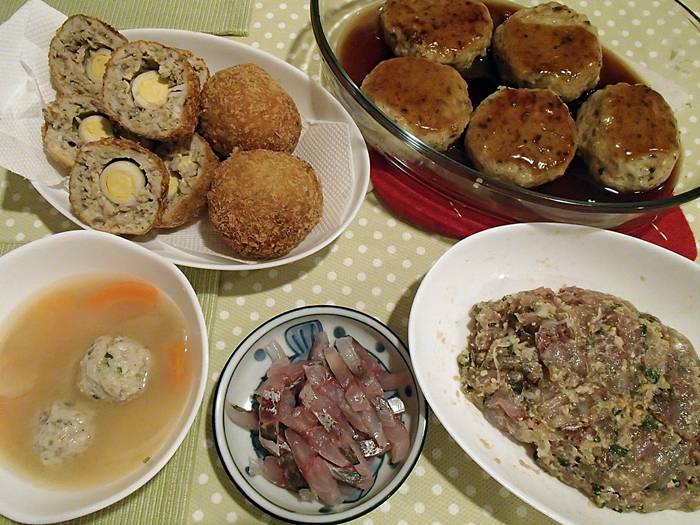 なめろう、ハンバーグ、スコッチエッグ、つみれ汁といつもと変わらないレシピだったけど、一番美味しかったのはアジのタタキだった。