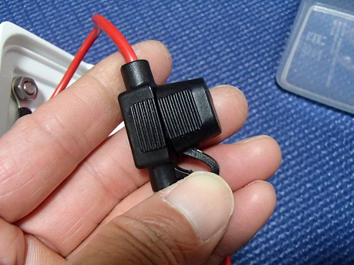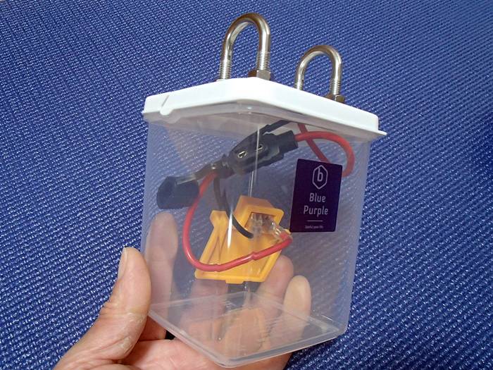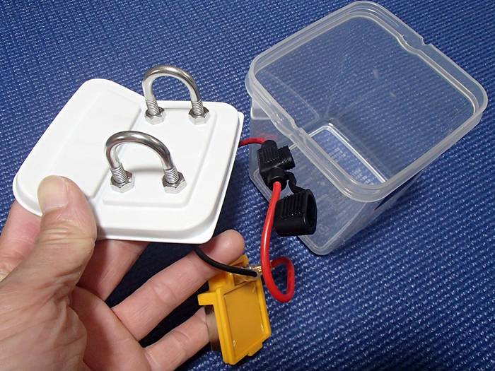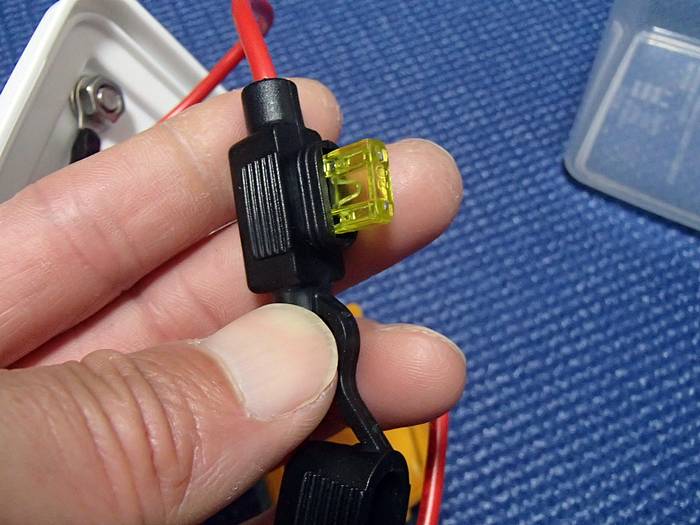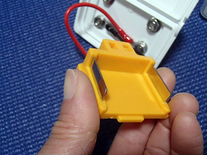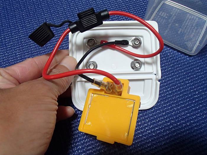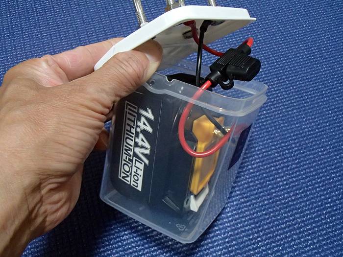 まぁ、防水ケースと銘打っているが、要はタッパーみたいな入れ物のフタにプラス・マイナスの端子が飛び出ているだけなんだけど、コレで十分である。