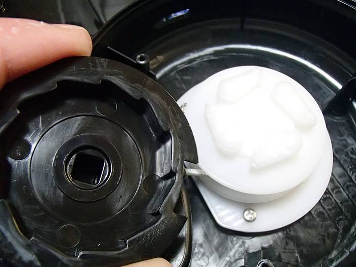 よくある不具合で、ヒモが伸びたまま戻らない故障の原因は、この部分のギヤが外れていることがあります。