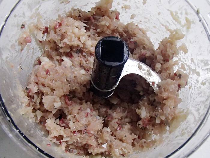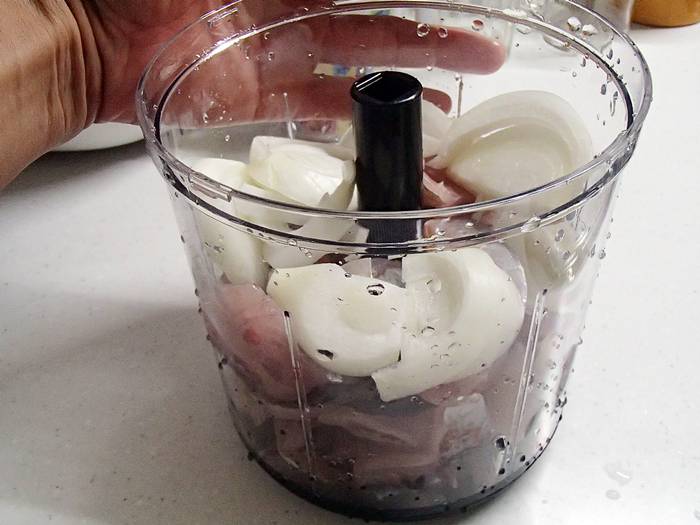 余裕の容量でまだまだ入るので、玉ねぎ1個と卵やら調味料やらを全部ぶち込み、一気にタネを作ってみた。