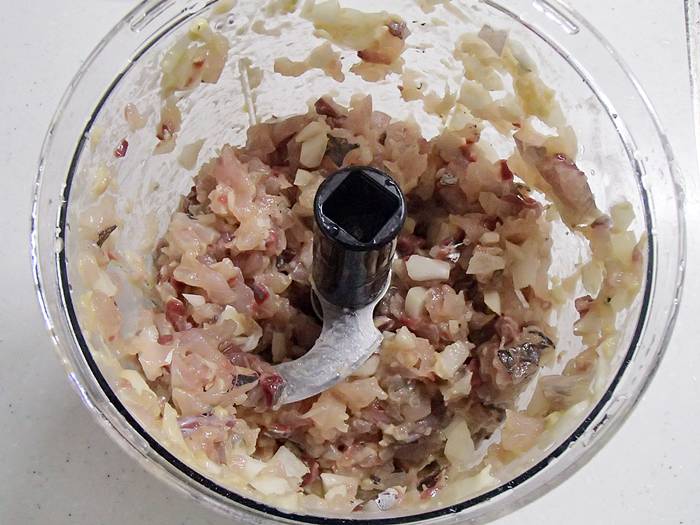 『なめろう』は、食感も残したいから包丁でトントンやってるけど、『ハンバーグ』と『スコッチエッグ』、『つみれ』は、みじん切り器でミンチにしています。